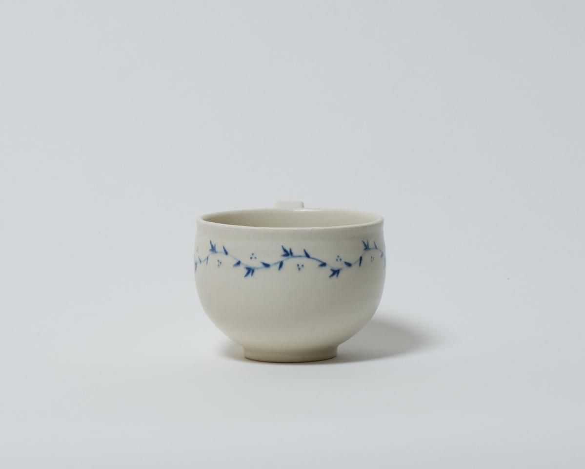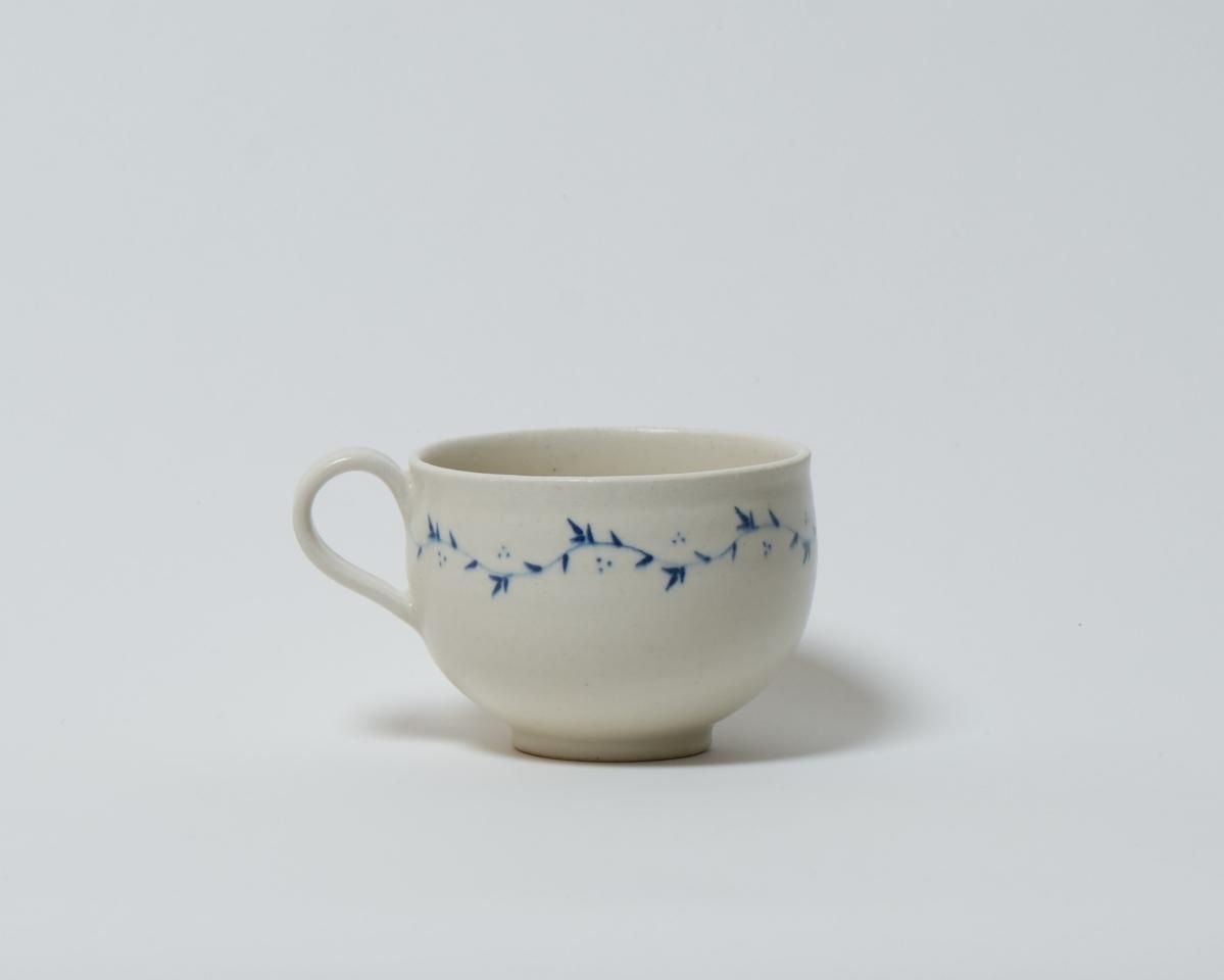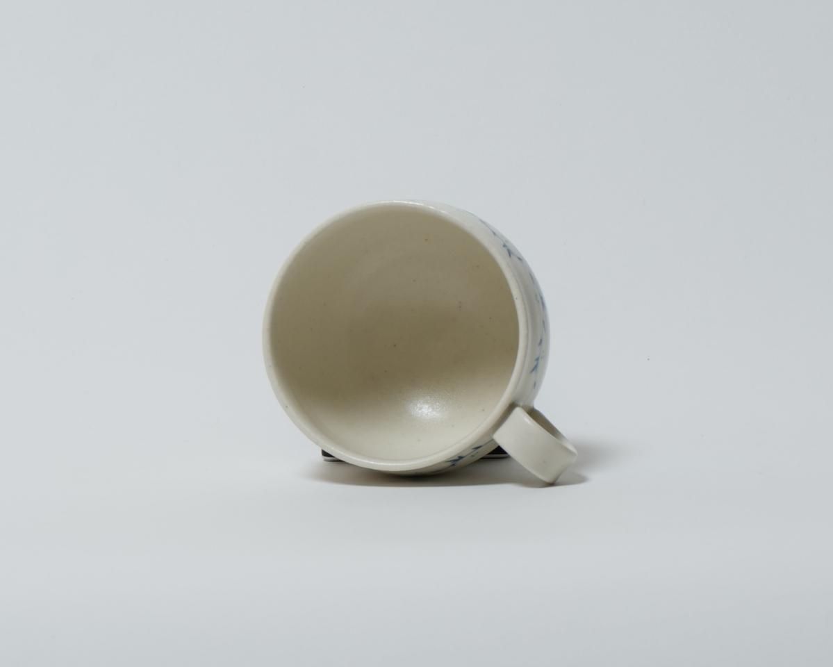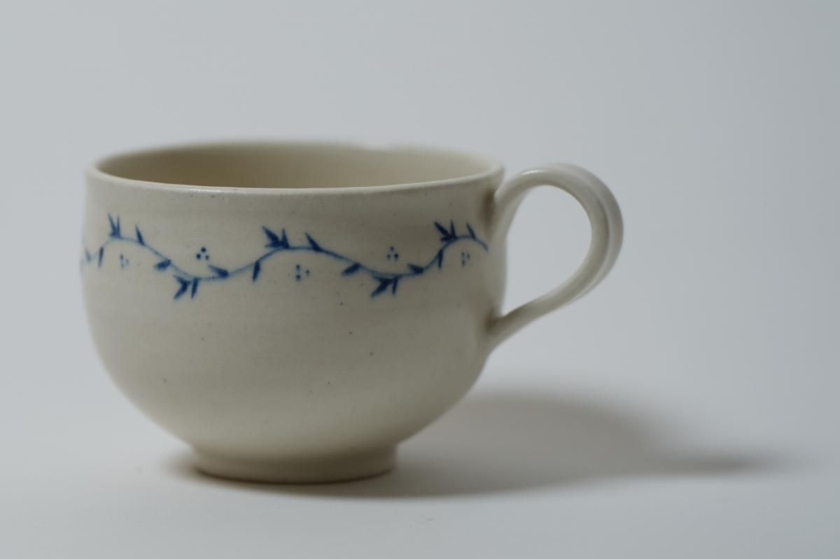 土のあたたかさ、使う人の生活にそっと寄り添ってくれる温かみのある作品です。青い植物の絵がさりげないマグカップです。